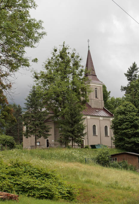Bezručova chata v roce 1978 vyhořela a před pár lety byla obnovena. Nicméně nepředbíhejme, zatím jsme stále na začátku výšlapu. Nohy poslušně zdolávají kopec. První krátkou zastávku si můžete udělat ještě v obci, je ale potřeba odbočit kousek z trasy. Nalevo se tyčí jako strážný orel nad Ostravicí farní kostel Českobratrské církve evangelické vybudovaný na konci 19. století. Zavítají k němu hlavně vyznavači geocachingu, pro které je tam uschovaná krabička.