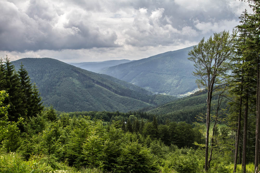 Hora začíná být strmější a strmější a výletníci tak musejí častěji střídat odpočinek s chůzí. Když se dostáváme na porostlou pastvinu, naskýtá se nám pohled na několik malebných chat vykukujících zpoza stromů.